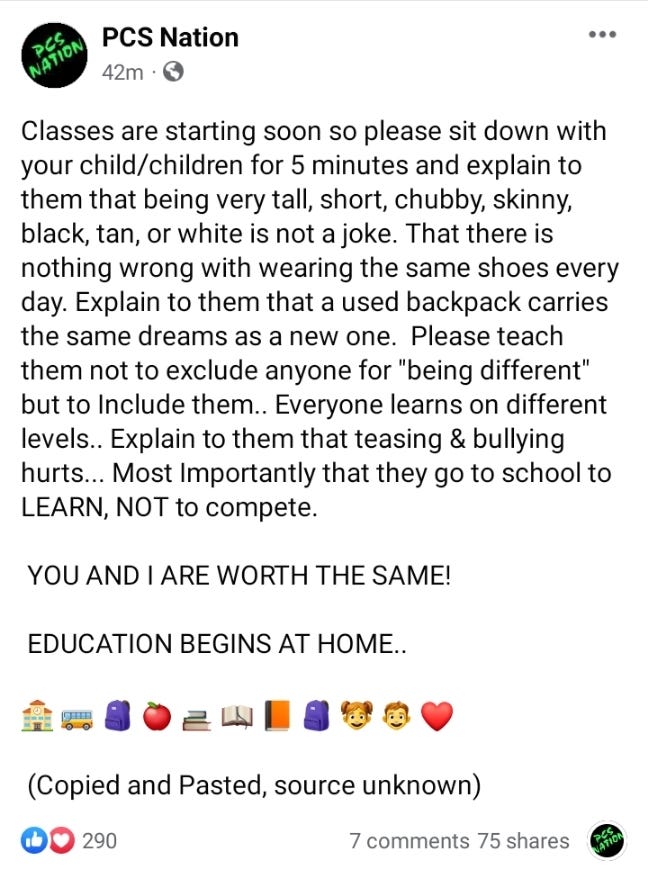 It's a wonderful sentiment. Unfortunately many who truly need to hear it will not because they are the parents who are otherwise occupied with their own obsessions and leave their children's care primarily in the hands of prog/left public school teachers (otherwise known as woke indocritnators and the highest paid babysitters in the nation). Platitudes such as this well-meaning paragraph will not help what is truly wrong but it will give a warm fuzzy feeling to those who already understand the message.